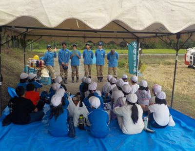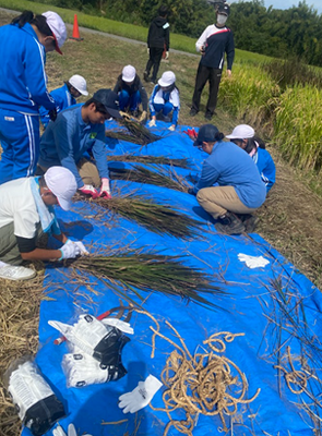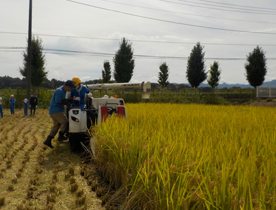 生物資源系列水田班が東横野小学生と稲刈り交流を行いました。