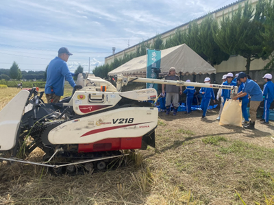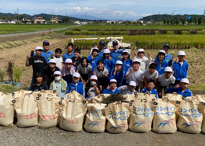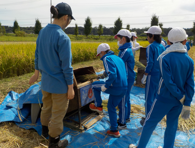 9月22日月曜日、安中スイミングスクール隣りにある本校水田で『稲刈り交流会』を行いました。4月のもみまき交流、5月の田植え交流、7月のオンライン観察会、2週間前に行った生育調査会を経て、今年も無事に小学生と栽培してきた稲も収穫を迎えることができました。今回はコンバイン乗車・手刈り、はぜがけ・とうみ、足踏み脱穀機の3つの体験をしてもらいました。今回小学生と栽培した品種は「虹のきらめき」といいます。来月には小学生と試食会を行います。