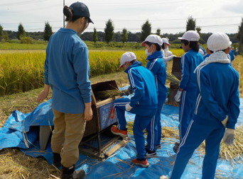 9月22日月曜日、東横野小学校と稲刈り交流活動を行いました。水田班6名と東横野小学校5年生29名と稲刈りの体験、とうみ、足踏脱穀機の体験を行いました。今回の稲刈り体験を通して、今と昔の稲刈りの仕方などを理解してもらうことができました。(文章:宇佐美)