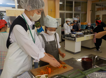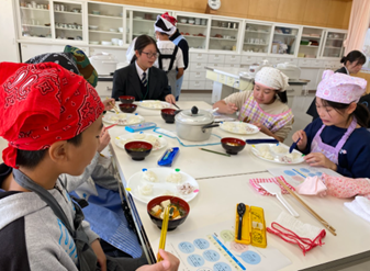 メニューは「いなり寿司・豚汁・フルーツヨーグルト」です。通常の調理実習とは異なり、1班に1人の推進員さんに入っていただいたので、切り方や味の付け方等、細かく聞いて、衛生的かつ会話の弾む実習となりました。