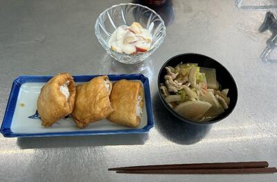 メニューは「いなり寿司・豚汁・フルーツヨーグルト」です。通常の調理実習とは異なり、1班に1人の推進員さんに入っていただいたので、切り方や味の付け方等、細かく聞いて、衛生的かつ会話の弾む実習となりました。